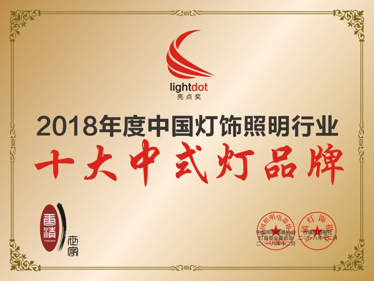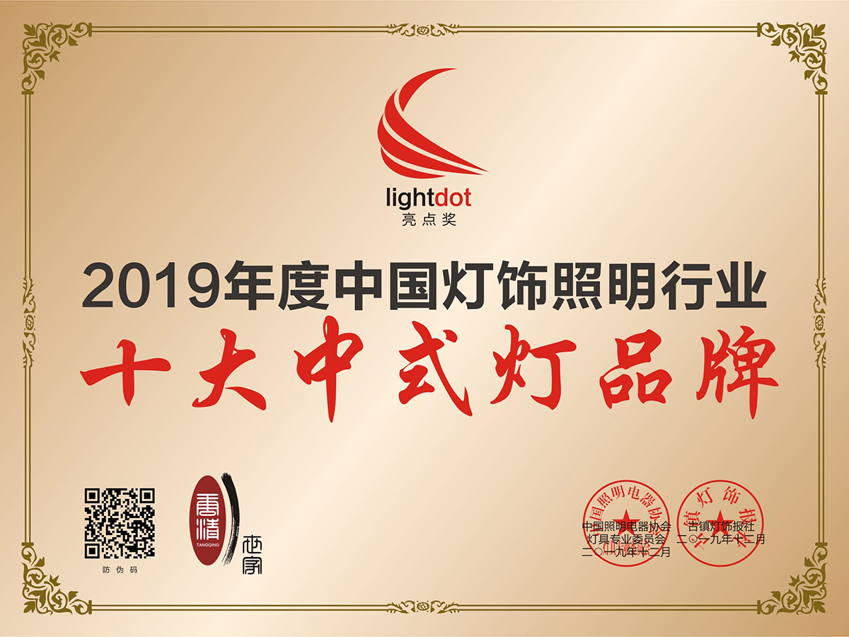 Tang Qing's Chinese lamps won the highest honor of "Top Ten Chinese Lamp Brands" issued by China's lighting industry for 2 consecutive years.